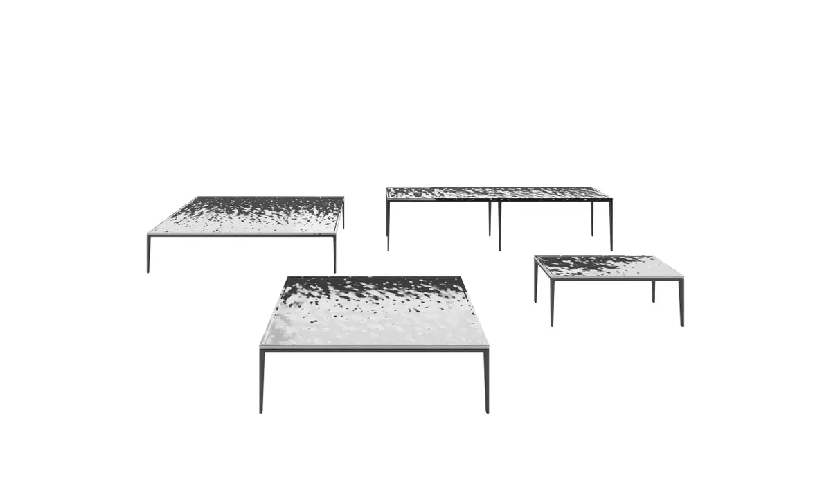 Soleide is a collection of small tables, in different sizes, with a die-cast aluminium base and a top in hammered mirror steel that gives them a particularly original and precious effect.