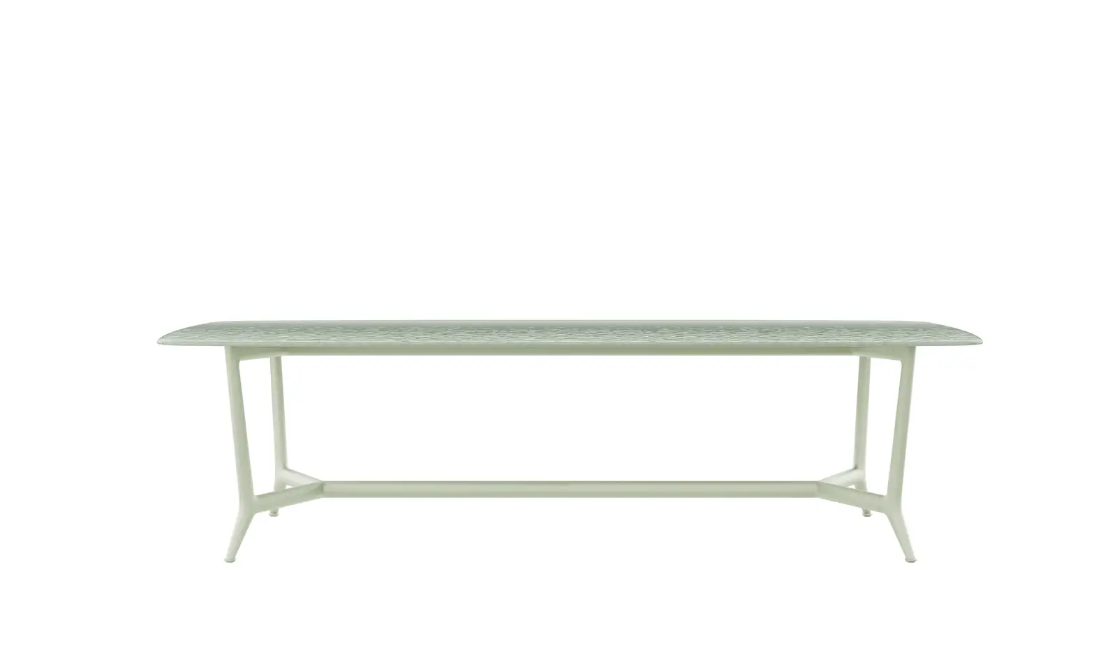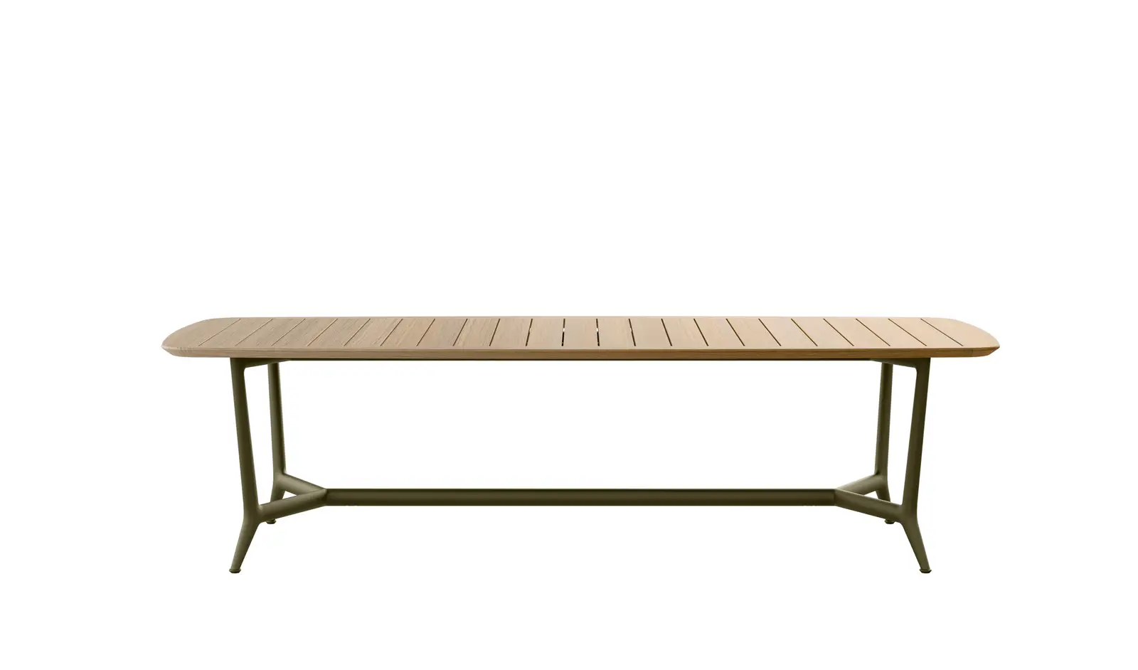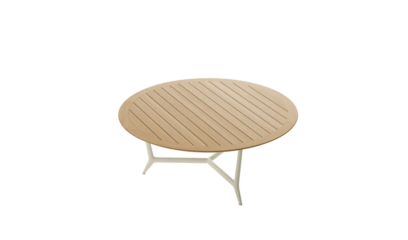 The Erica dining tables are offered in a rectangular version in two sizes and a round version in a single size. They combine powder-coated die-cast aluminium structures in five colours – anthracite, dove grey, olive bronze, aquamarine green, cream white – with slatted tops in natural teak or molten glass – a process that creates organic textures and irregularities on the surface for a distinct tactile effect – back-painted in colours jade green, emerald green and coral red.