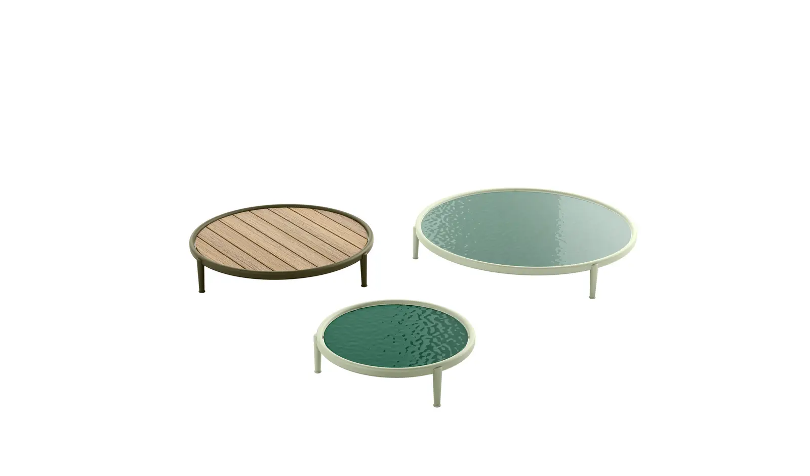 The Erica small tables, in three round sizes and two heights, combine powder-coated die-cast aluminum structures in five colors – anthracite, dove grey, olive bronze, aquamarine green, cream white – with slatted tops in natural teak or molten glass – a process that creates organic textures and irregularities on the surface for a distinct tactile effect – back-painted in jade green, emerald green and coral red.
