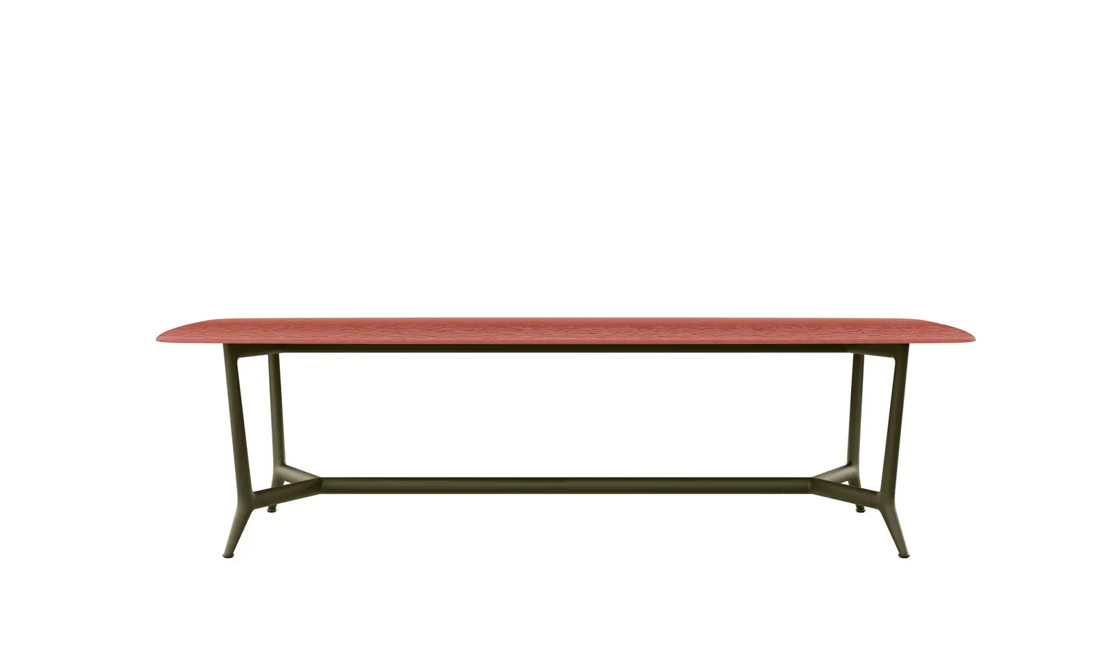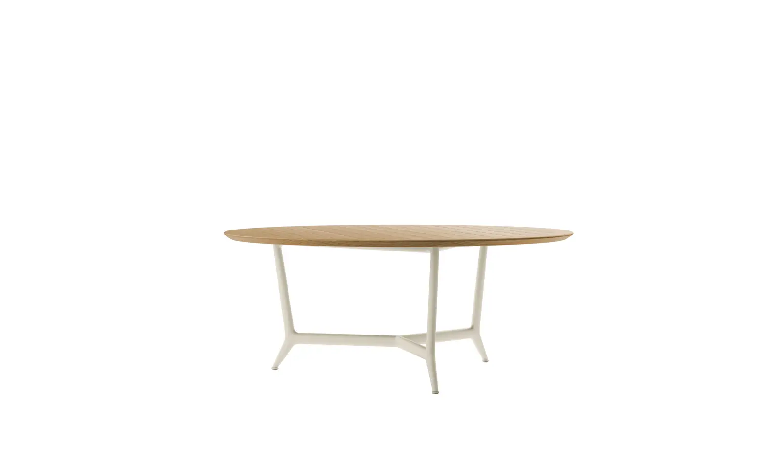 The Erica dining tables are offered in a rectangular version in two sizes and a round version in a single size. They combine powder-coated die-cast aluminium structures in five colours – anthracite, dove grey, olive bronze, aquamarine green, cream white – with slatted tops in natural teak or molten glass – a process that creates organic textures and irregularities on the surface for a distinct tactile effect – back-painted in colours jade green, emerald green and coral red.