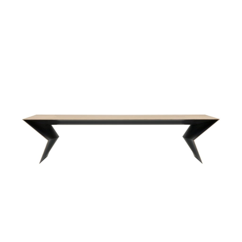 A sculptural and unexpectedly powerful table produced in a limited and numbered edition of only 100 pieces, Blitz stands out for its flat, slim, geometric external frame, which finds its natural completion in the curved and sinuous shapes of the interior, revealing aesthetic and constructive solutions reminiscent of a suspension bridge